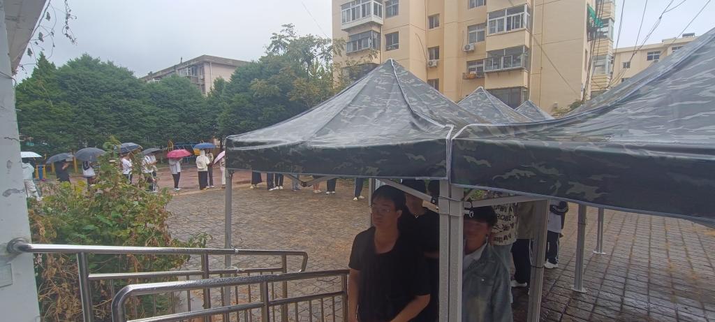 当天下午,降雨如期而至,而体检现场秩序井然。遮雨棚下,新生们按照指引有序排队,避免了淋雨带来的不便与健康隐患。许多新生表示,虽然天气阴沉、雨水淅沥,但校医院周到细致的安排让人倍感温暖。“没想到学校考虑得这么周到,看到棚子搭起来,心里一下子就踏实了。”一位正在排队等候体检的新生说道。